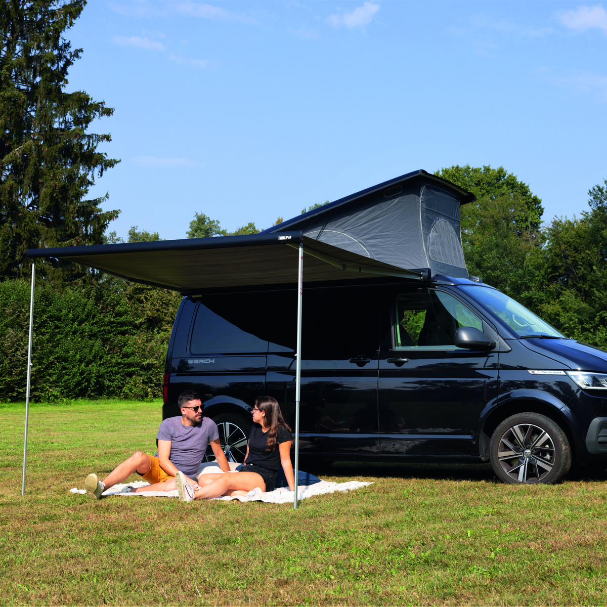 Mit der FIAMMA® F43van machst du deinen Campingbus in wenigen Sekunden bereit für Sonne oder Regen. Wandmarkise mit Magnetkurbel, kompakt gebaut und im Design optimal an Busse mit oder ohne Aufstelldach angepasst.