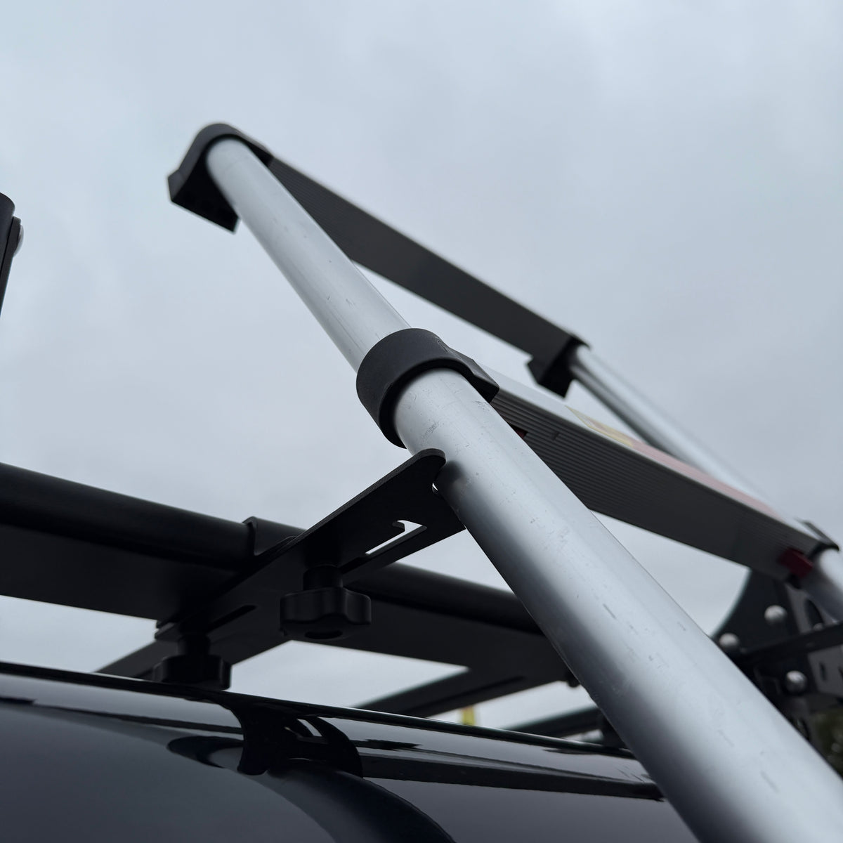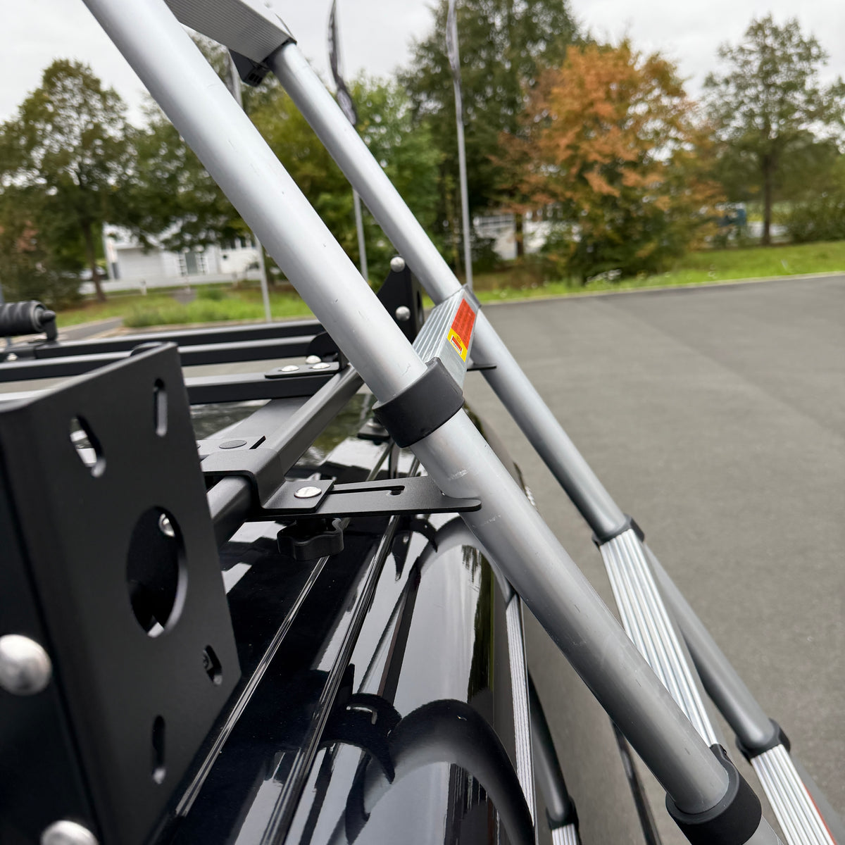 Mit der ND-Rack Stützhalterung kannst du deine Leiter sicher am G1 Dachträger anlegen.