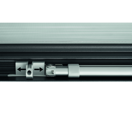 Die teleskopierbare Handkurbel öffnet und schließt die Markise leichtgängig. Speziell entwickelte Dichtungsgummis mit integriertem Drainagesystem dichten den Spalt zwischen Fahrzeug und Markise ab und leiten Regenwasser automatisch ab.